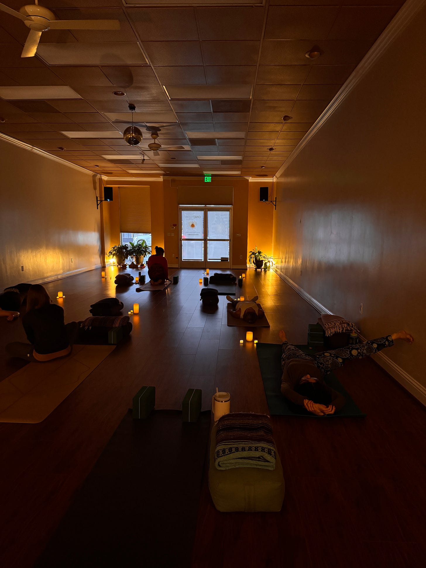 Right away, I notice the vibes are different. The lights are dim, highlighting a handful of LED candles scattered around the room. Normally the floor is empty at the beginning of class, a blank canvas of sorts. But tonight the room is pre-arranged: props dot the floor, set up like dominoes in neat little rows. Each spot has a bolster and blanket, beckoning all of us to stay soft.